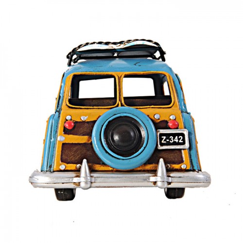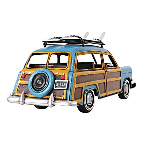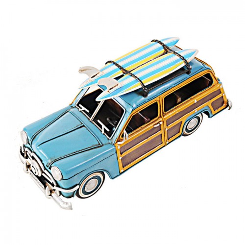 An American automobile produced by the Ford Motor Company after World War II. It is made of iron and has a scale of 1:12. It features intricate details such as license plate, grill, wheels, surfboards, and paint job.