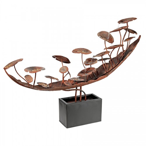 Save an empty space that needs a grand Asian water sculpture? This spectacular water feature, at almost six-feet long, and almost four-feet tall, will fit perfectly! The sculptural Grande Asian Botanical Cascading Metal Fountain creates a peaceful atmosphere and will make enormous impact in the garden, on the deck or patio, or at reception of an office. Water works its way from the tallest aged-copper lily pad and flows endlessly down seven lily pads accented with the included glass pebbles, to the center where it constantly recycles water from a hidden reservoir in the black base. The huge, hand-crafted metal, banana leaf boat supports twenty lily pads creating perfect harmony. One of the largest fountains we have ever offered, our fountain can be placed indoors or out. This investment in fountain art features an integrated, UL-listed, indoor/outdoor pump. Bring inside during freezing temperatures. Simple assembly required.