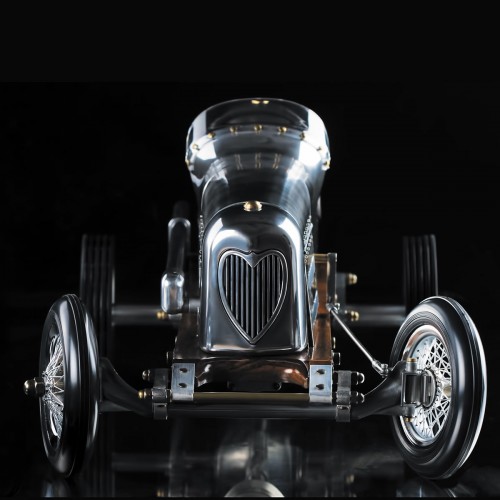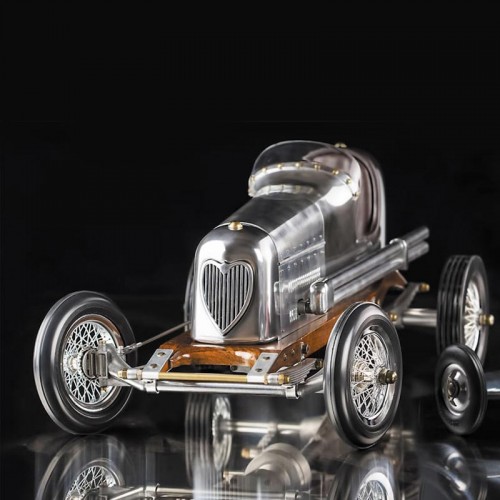 The 1930s saw the rise of hand built model racecars, known as spindizzies or tether cars. Miniature racecars built by hobbyists zoomed around banked wooden tracks at speeds approaching 150 miles per hour. Resembling the full-size racers of their day, several spindizzies competed at once, tethered by cables to a central pole. Powered by model airplane engines, spindizzies raced against the clock. Incredibly detailed and aerodynamic, these miniature racecars were beyond toys; they were pieces of art representative of the best pioneering technology of the era. Constructed using original blueprints, our Bantam Midget model resembles the original down to the smallest detail. One look and you'll be ready to join the competition.