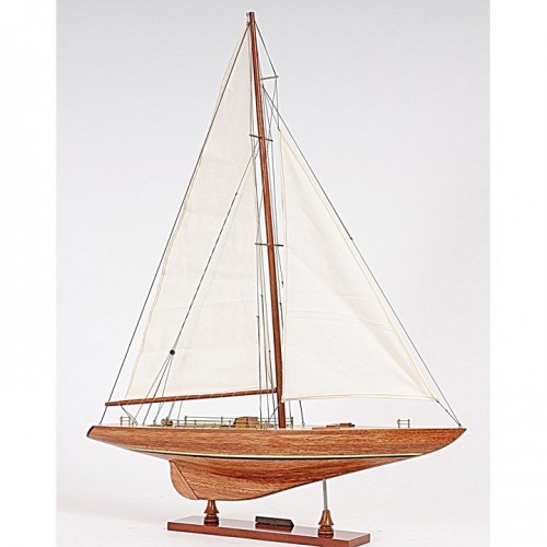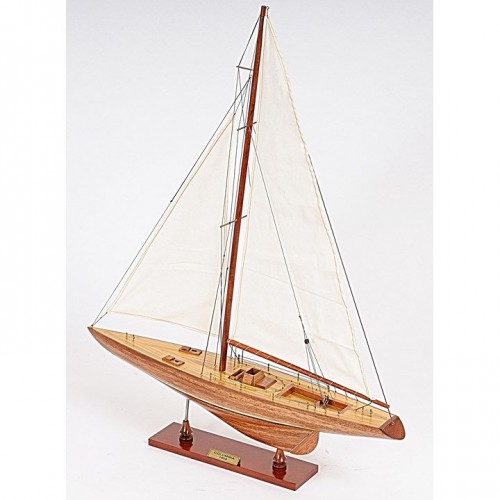 The Columbia yacht was built in the Nevins Yacht by Olin Stephens who brought all his vast and sound experience in the design of the 1958 Americaís Cup Defender. This 12 meter yacht had a wooden hull and could sail at very high speed. This model will make a perfect gift for home or office decorator, boat enthusiast, or passionate collector. Master craftsmen handcraft these highly detailed wood models from scratch using historical photographs, drawings and original plan. They are built to scale with high-grade wood such as: western red cedar, rosewood, and mahogany. They are 100% hand built individually using plank-on-frame construction method and are similar to the building of actual ships. Each model requires many hours to finish and must go through a demanding quality control process before leaving the workshop. The Columbia yacht beauty is amazingly captured by the full sails that extends all the way up to the masthead. The hull is made of teak with painted waterline. Wooden hatches can be seen on the deck near the bow. Metal stanchions and railings can be seen around the cabin. The backstay rigging is tightly connected from the transom to the top of the mast. The main sail, jib, mast, and intricate rigging complete the definition of a true sailing boat. The model is secured tightly on a wood base with a brass name plate. The mast and sails are folded down for easy shipping.