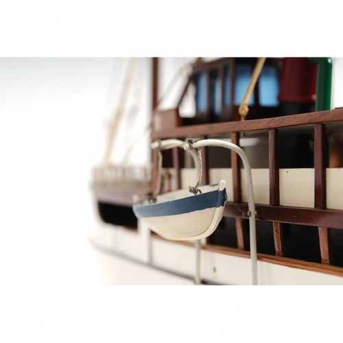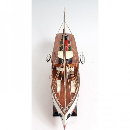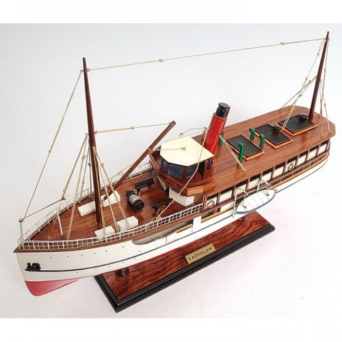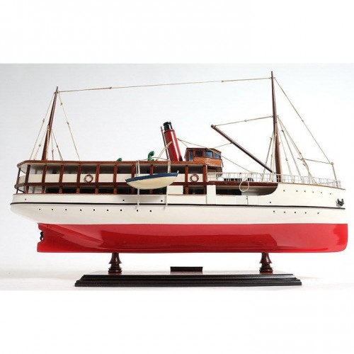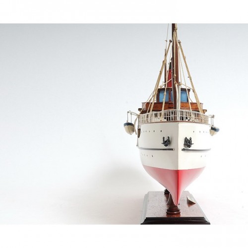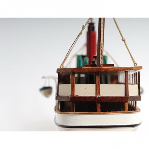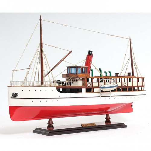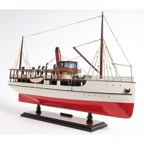 Our Earnslaw model is made of only the highest materials such as rosewood, mahogany, teak, ebony, and many more. It is painted in solid red and white color. The detail is amazing: tall wooden towers connected to each other by rigging, hand built wooden benches, rope crane, see through 3-D upper and lower deck, metal and wooden fences on top deck, lower deck are surrounded with wooden fences, window are crafted to see-through, single propeller, and many more exclusive ornaments. This beautiful model is rested on a painted wooden stand with two firm crafted wooden poles sustaining it. To enhance its value and recognition, a golden metal plate embedded with ìEarnslawî is neatly glue to the stand. This model is completely hand built by skillful and creative master craftsmen; you will be amazed at how real it looks. Months of research goes into the planning of these model boats. Original plans and pictures are used for their design and realism. This wooden model boat is shipped fully-assembled and ready to be displayed.