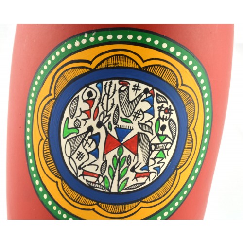These exclusively eye-catching and heart-melting vases are handmade with terracotta material and hand-painted with fine detailed Warli paintings by tribal artists from the interiors of India. Motivated from the native folk art of the Warli tribes, these earthen vases have been hand embellished with Warli tribal paintings that depict scenes from their everyday lives such as men playing instruments, riding horses, hunting scenes, community living, celebration, happiness and festivities.Vases are available in different sizes and styles. The compact Warli design and its effectiveness with brush strokes of paints on terracotta, conveys the uniqueness of the oldest form of art in Indian history. As soon as the admirer comes in contact of these hand-painted and handmade terracotta vases, they can get the feeling and experience of the scenes of tribal life that includes but not limited to their folk music, dances and festivities. This collection of hand-painted vases is a pleasing story from the Indian tribal cultures, handmade with love, to bring the raw warm ethnicity of tribal life to your favorite spaces whether it can be a conservation piece for your office or your home or can be a gift for someone you love.