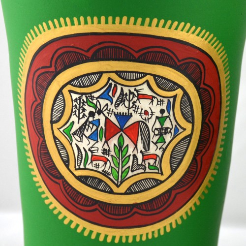 These exclusively eye-catching and heart-melting vases are handmade with terracotta material and hand-painted with fine detailed Warli paintings by tribal artists from the interiors of India. Motivated from the native folk art of the Warli tribes, these earthen vases have been hand embellished with Warli tribal paintings that depict scenes from their everyday lives such as men playing instruments, riding horses, hunting scenes, community living, celebration, happiness and festivities.Vases are available in different sizes and styles. The compact Warli design and its effectiveness with brush strokes of paints on terracotta, conveys the uniqueness of the oldest form of art in Indian history. As soon as the admirer comes in contact of these hand-painted and handmade terracotta vases, they can get the feeling and experience of the scenes of tribal life that includes but not limited to their folk music, dances and festivities. This collection of hand-painted vases is a pleasing story from the Indian tribal cultures, handmade with love, to bring the raw warm ethnicity of tribal life to your favorite spaces whether it can be a conservation piece for your office or your home or can be a gift for someone you love.