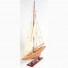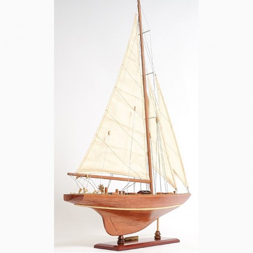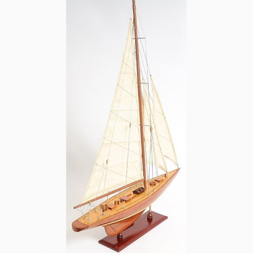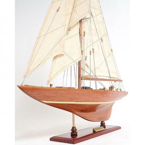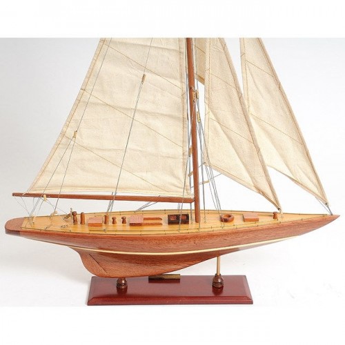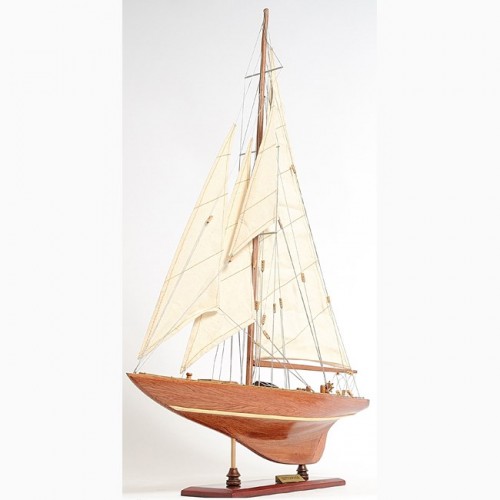 Our Enterprise Yacht model is scratched built plank on frame by skillful and creative master craftsmen. Strip by strip of mahogany and teak were put together. It was built according to scale through original plans, pictures and drawings. The hull is truly beautiful; It was carefully put together using the best material to create a smooth surface on both sides. On the yacht, you can easily locate gorgeous wooden parts and ornaments such as: wooden mast, wooden boom, wooden bunkers, front and main sails with detailed stitching, wooden pole and metal steering, metal railing, and many more. We only use high quality wood and metal to build the model, absolutely no plastic parts. This beautiful model is rested on a painted solid wooden stand. To enhanced value and recognition, a shiny metal plate embedded with ìEnterprise 1930î is provided. The masts are fold flat down for shipping purpose. Assembly in minutes.