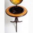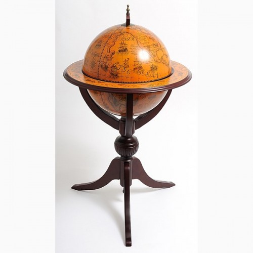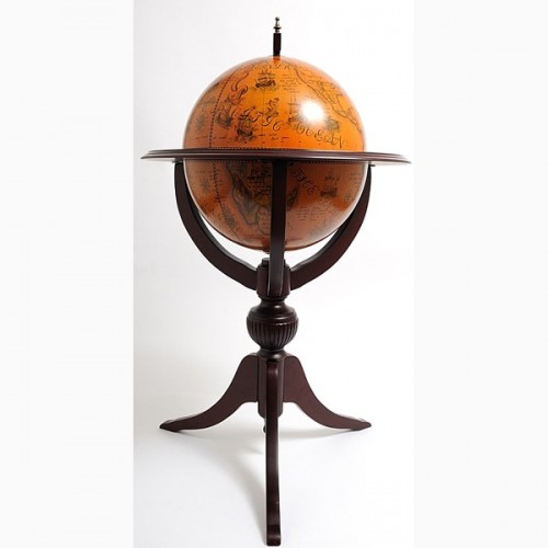Featuring an old nautical map on its surface, the globe can be lifted to reveal the hidden drink cabinet and the highly decorated interior. This cabinet is made of wood and painted in dark red mahogany. Globe measures 17.75 inches diameter. Overall dimension: 44x25x25. Some light assembly needed.
