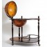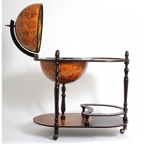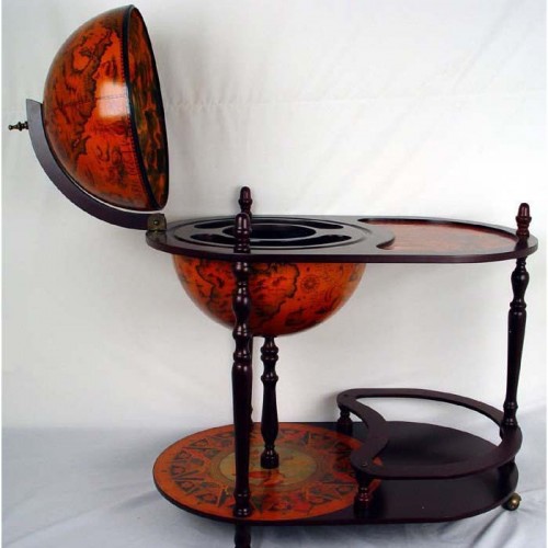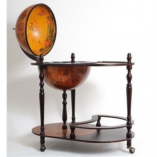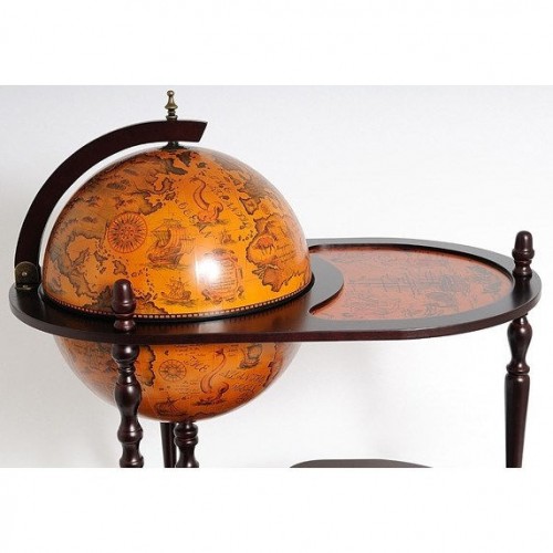 Featuring an old nautical map on its surface, the globe can be lifted to reveal the hidden drink cabinet and the highly decorated interior. Glassware and bottles can be placed at the bottom shelf as well as inside the globe. The cabinet is made of wood and painted in dark red mahogany. It comes with round carved wooden floor stands on the wheels. This drink trolley measures 16.5 inches of globe diameter. Overall dimension: 32x20x36 inches. Come in 2 separate packages with complete assembly instruction.