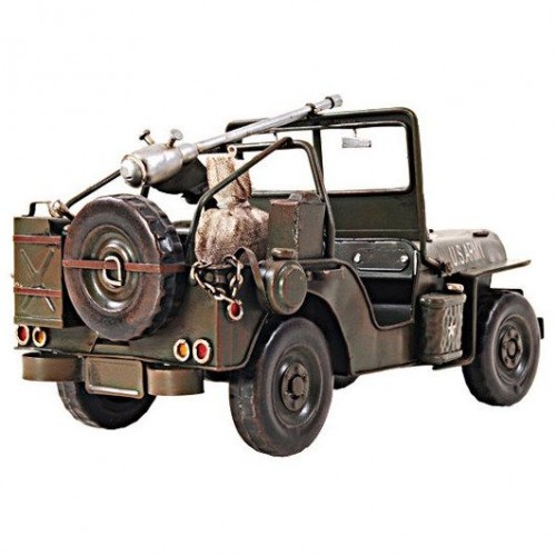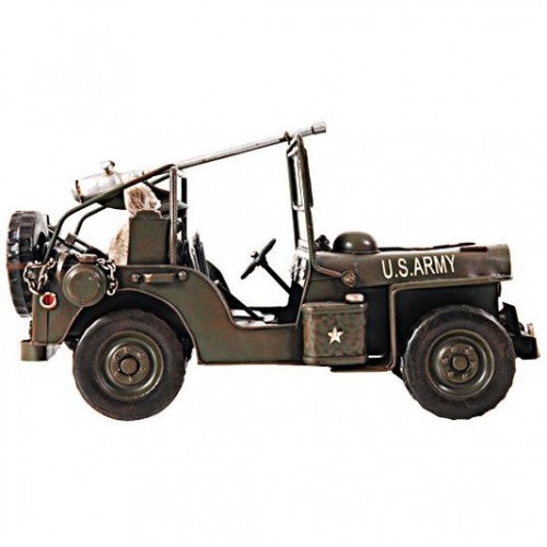 Drive back in time with this iconic 1940 Willy Overland Jeep from the World War II era. Handcrafted of iron with a scale of 1:12. This Jeep model comes with fine details such as wheels, hood, headlights, fenders, and machine gun. A must have for the collector and enthusiast! ï 100% iron frame ï Metal wheels ï Wheels roll ï Decaled insignia ï Includes seats, steering wheel, stick shift, and small details on dash ï Exterior details such as the guns and shovel are securely welded on ï Sandbag in the back make out of canvas material for more authentic look