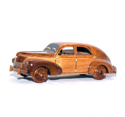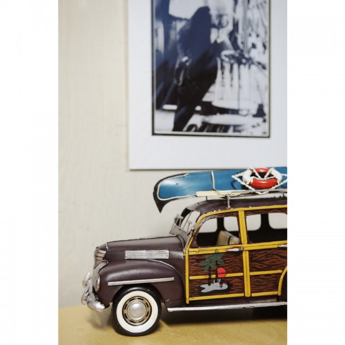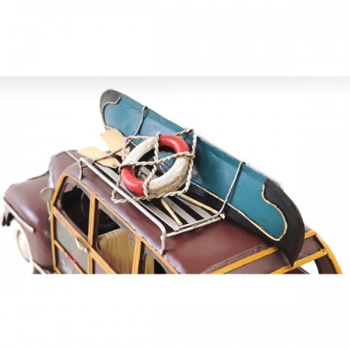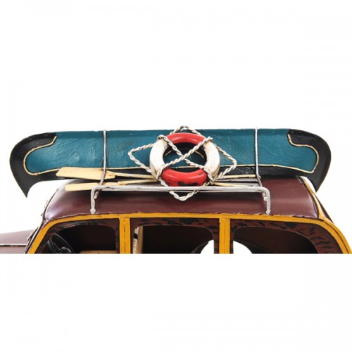 Travel back in time with this vintage 1947 Chevrolet Suburban model. A classic American wagon made just after World War II. Made of metal, it features many intricate parts such as fenders, wheels, hood, grills, roof rack, and canoes with paddles. A perfect gift to display in your home or office!