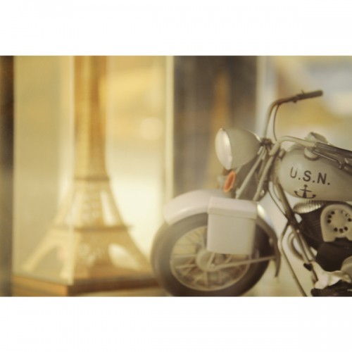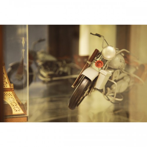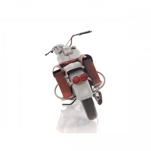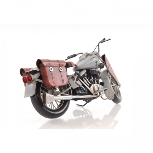 This 1945 motorcycle was produced to US Army specifications in the years during and around World War II. This vintage 1945 model was handcrafted of iron. It is painted grey and has a scale of 1:12. It features intricate details such as spoke wheels, seat, light weight frame, pedals, storage compartment, and a wind screen. A must have for the collector and enthusiast!