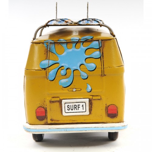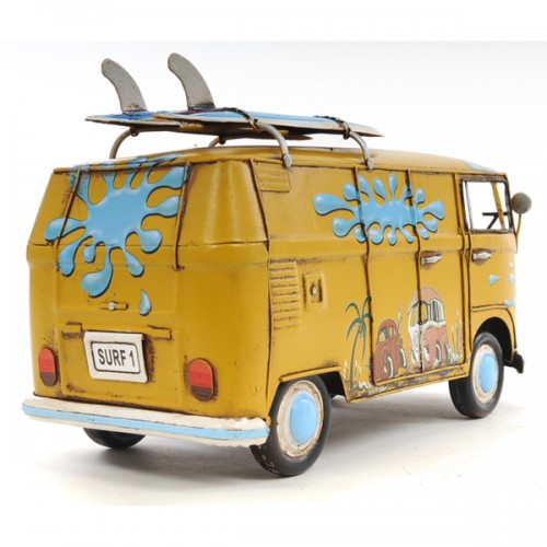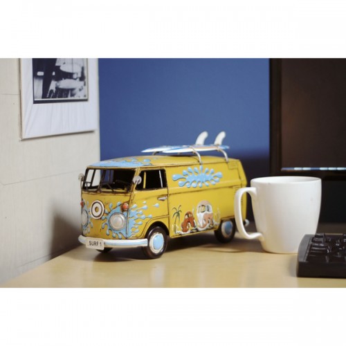Nothing captures the spirit and nostalgia of the 1960s like a Volkswagen Bus with its split window screen. This 1967 Volkswagen Bus is scale at 1:18. It is handcrafted in iron, with remarkable level of fine detail and in a Union Jack Design. It features authentic paint, light weight body chassis, and two surfboards on a roof rack. A must for the collector and enthusiast!