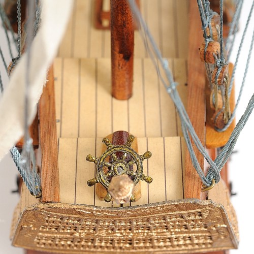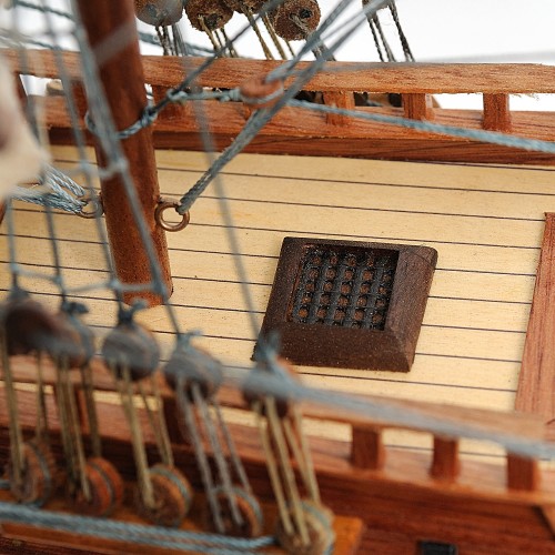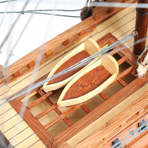 They are all connected to numerous fabric sails with detailed stitching, all rigging are painstakingly fastened by hand in matching colors. There’s a small wooden cabin with a wooden boat on the main deck. On the quarter deck, there’s a wooden cabin. There are wooden fences surrounding the beakdeck area toward the quarter deck area. You can easily spot a large number of metal cannons on both side of the hull, and other crafted metal parts on the front and back of the ship.