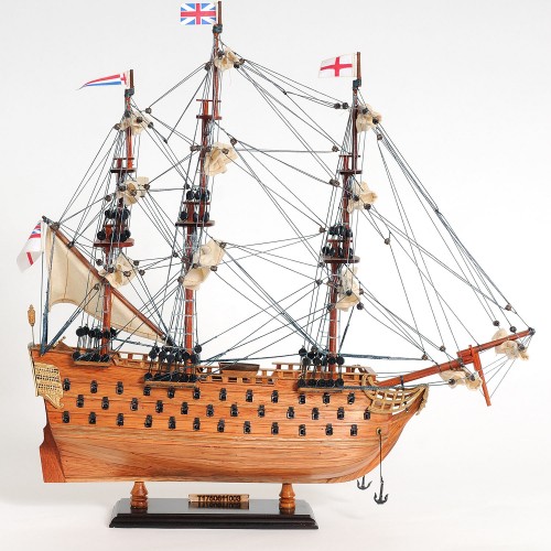 Our HMS Victory model is a smaller scale version of a much larger version such as the HMS Victory 36” and the 56”. Our model is handcrafted from beautiful wood such as rosewood, mahogany, teak, and along with various other exotic wood. The hull is constructed using a plank on frame method, each strip of exotic wood are carefully join together to form a smooth hull. This model is completely hand built to spec by skillful and creative master craftsmen; you will be amazed at how real it looks. The ship has a clear varnished coating follow with amazing details. On the ship, you will spot amazing details such as: wooden bowsprit, foremast, mainmast, and mizzen mast.