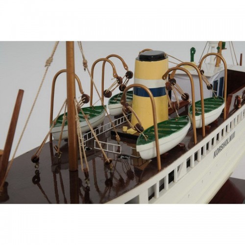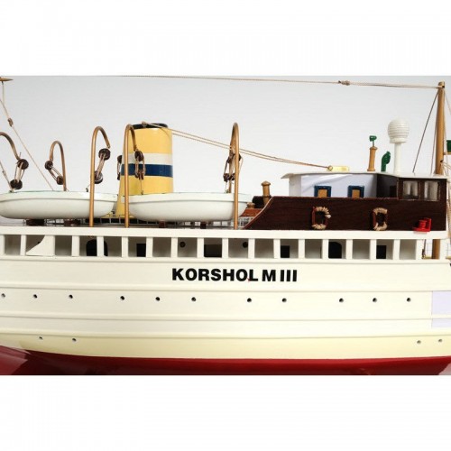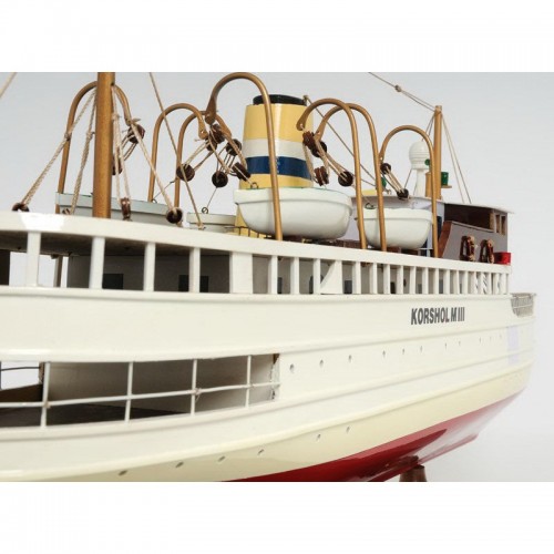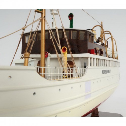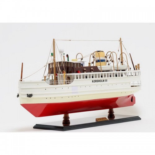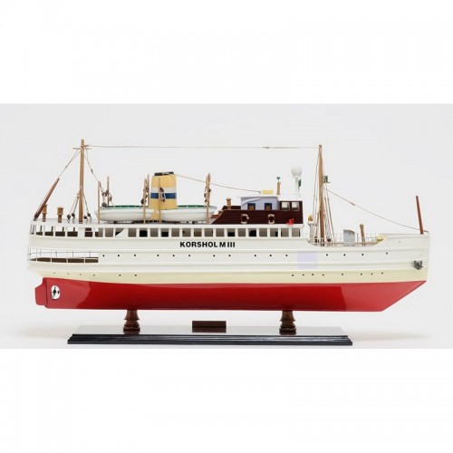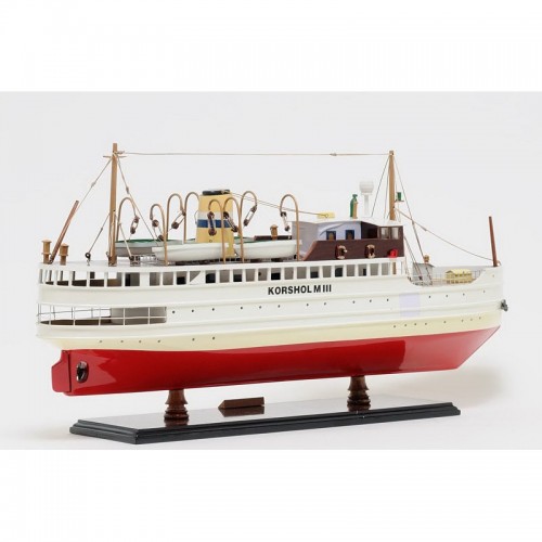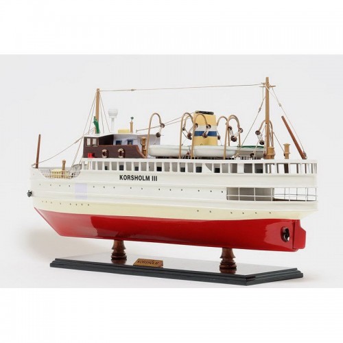 Our Korsholm III model is truly one of a kind. It is handcrafted from beautiful wood such as rosewood, mahogany, teak, and along with various other exotic wood. The hull is constructed using a plank on frame method, each strip of exotic wood are carefully join together to form a smooth hull. This model is completely hand built to spec by skillful and creative master craftsmen; you will be amazed with its formation and at how real it looks. It is carefully painted in lustrous original color: red and white. The construction is absolutely incredible: see-through 3-D of the two stories rear deck, countless windows on the two decks, wooden navigation towers, wooden canoes, wooden benches, metal fences around all deck, painted windows, ìKorsholm IIIî imprinted in black on both side of the ship, and along with many more exclusive ornaments. This beautiful model comes standard with an attached wooden stand with a nameplate engraved ìKorsholm IIIî. Our model was built according to scale through original plans, pictures and drawings. We absolutely use no plastic parts only the highest quality wood and metal parts. Our Korsholm II model boat is shipped fully-assembled and ready to be displayed.