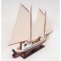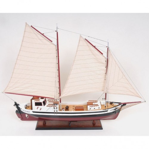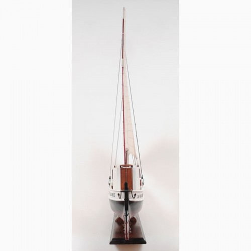 This model hull is handcrafted from strips of wood using plank on frame construction method. It is then painted in three colors. The deck is beautifully planked from many strips of wood. There are various details on the deck such as hatches, winches, and cabin. Located on the deck is a metal tilter near the companionway. The stitched sail and intricate rigging complete the definition of a true sailing boat. The model is secured tightly on a solid wood base with a brass nameplate. The mast and sail are folded down for easy packaging and shipping. Itíll make a perfect gift for home or office decorator, boat enthusiast, or passionate collector.