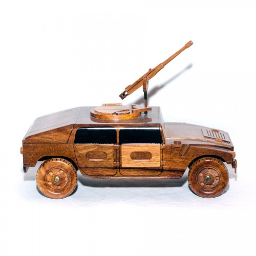 This is the high quality Mahogany Military HUMVEE Model with 50cal machine gun has a movable gun mount and wheels scale model, 100% hand-made by expert craftsman. It takes from 20 - 24 hours to make a complete product. Handcrafted from solid mahogany, consists of: rudimentary wood processing, carve, craft and cover of polyurethane (2 coats), which keeps these unique sculptures attractive for years. Movable wheels, finely detailed molding and seam details, make this model a great gift or conservation piece. It can be displayed in office, house, room, desk or used as a valuable item for your collection. This is a very well designed detailed wooden sculpture and it is a perfect gift for birthdays, wedding anniversary, or any other special occasion. It is truly a surprise gift for your friends or loved ones or can be a nice collection for your home.