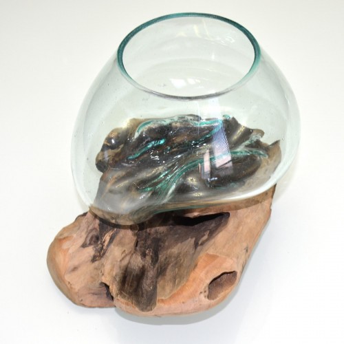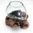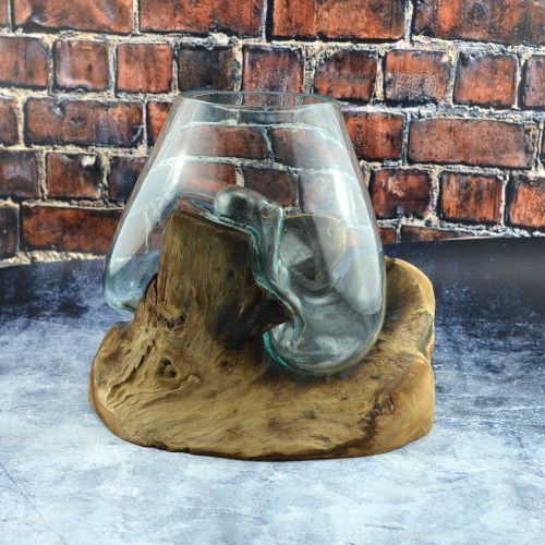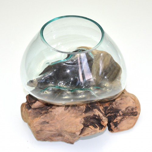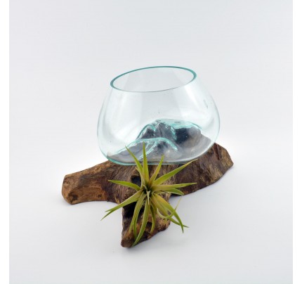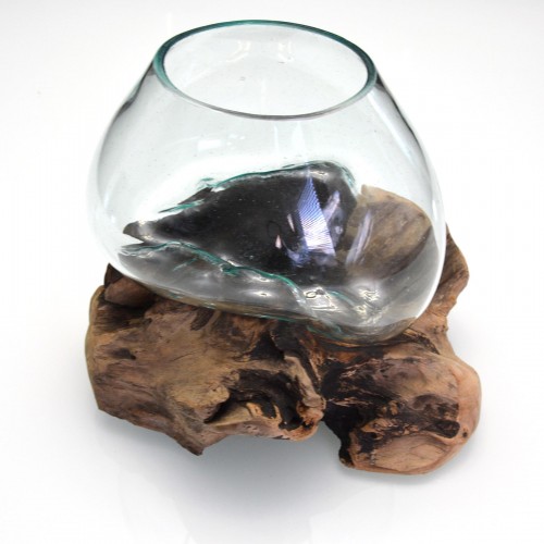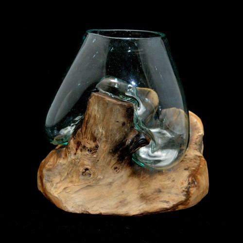 The base is driftwood from Indonesia, this is draped with a hand blown glass vase, which transforms on an unique, organic form adapting to the corners and ridges of the natural wood, the glass bowl has a lava-like effect. On its own, the piece is an unique, statement and sculptural accent for any room, but it can be put to use as well. It provides one-of-a-kind setting for stones and air plants, cut flowers, fish tank or a wine decanter. Because of the nature of the materials, no two will ever be alike.