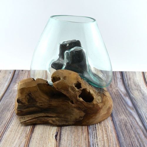 Each item is unique as they are made from natural teak wood and recycled glass is shaped to suit which add to its authenticity.