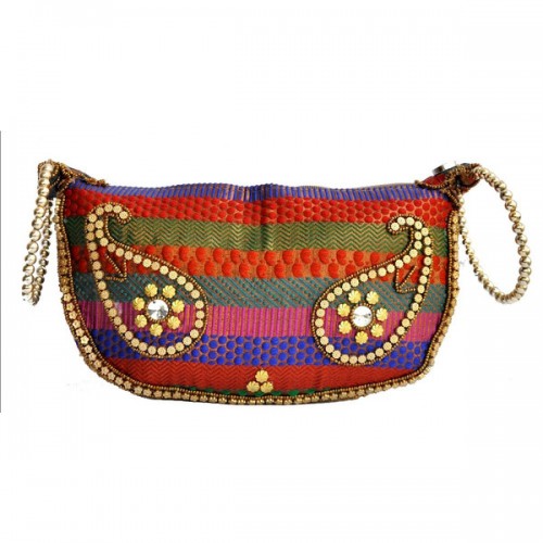 This beautiful multicolor golden touch ethnic potli bag is adorned with traditional work and is in rich. A potli bag represents versatility and style. It is made of brocade cloth and has elaborate golden bead work on it. It closes with a zip and also has a magnetic button to make it fold in. Bangle shaped golden handles enhance its beauty even more.