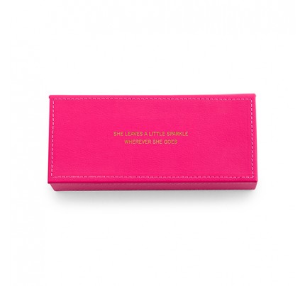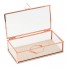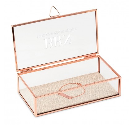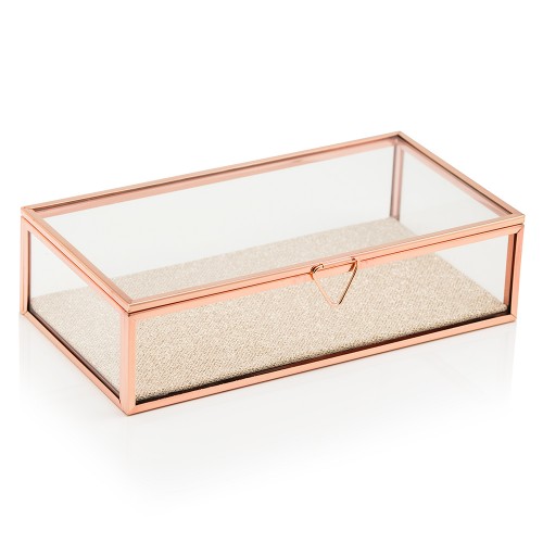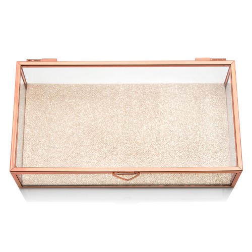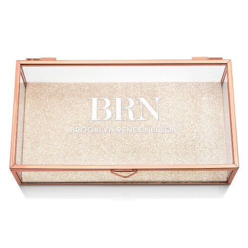 Show off your best jewels and keepsakes in this elegant glass jewelry box featuring rose gold edges, a hinged glass lid and a sparkly fabric lined bottom. The generous proportions of this glittery and glass beauty will look stunning on your dressing table while keeping your favorite jewelry and trinkets on display. Etched with a modern serif monogram and name, this jewelry box makes a personalized gift suitable for any girly girlfriend, bridesmaid or flower girl.