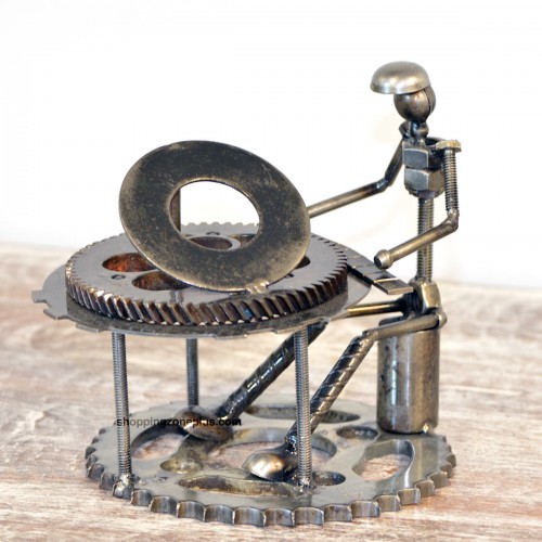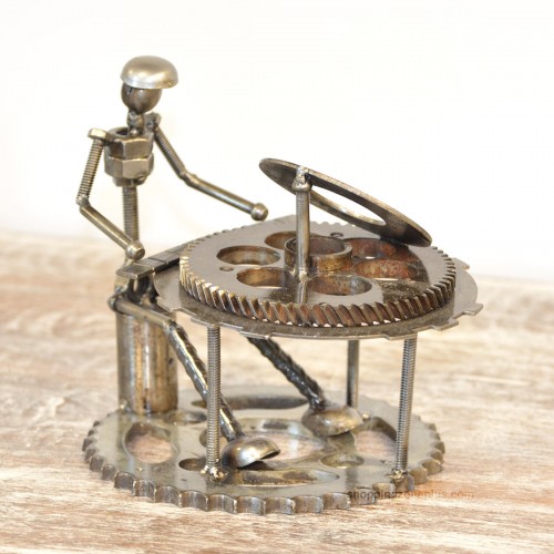 This is a pianist playing a tune on a grand piano. This figure utilizes several screws and screw nuts, a couple of gears for the base and the piano’s body, and several hand-crafted metal plates. Popular among music lovers, this piece hopes to mimic the grace and confidence of a master pianist.