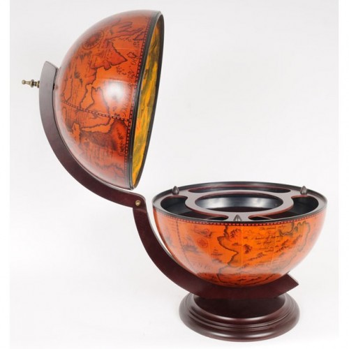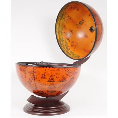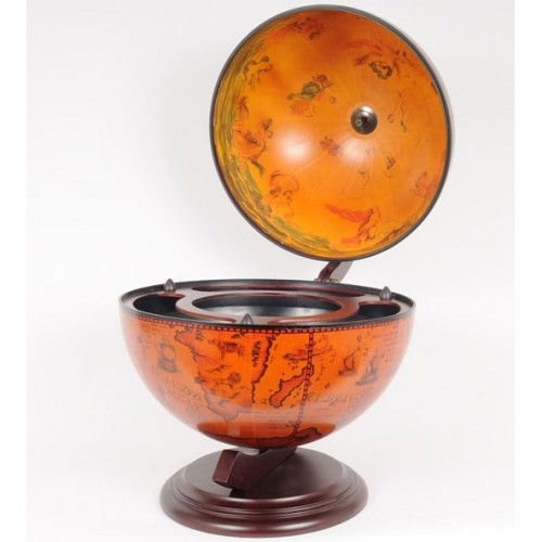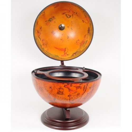 Measured 13 inches in diameter, this globe will make a fine gift or decoration for your home or office! It features four interior sections to store bottles and glassware. Under the lid youll find stunning antique replica frescoes . In addition, the outer surface is imprinted with an antique nautical world map. The globe is turn-able and comes with a dark wood base. Some light assembly is required; instruction is included.