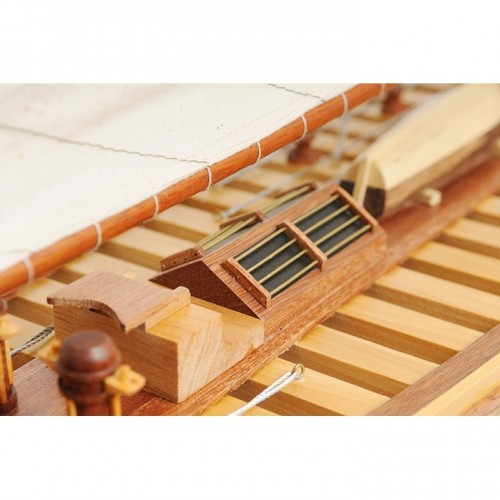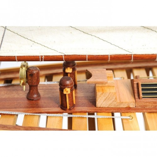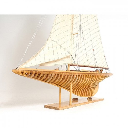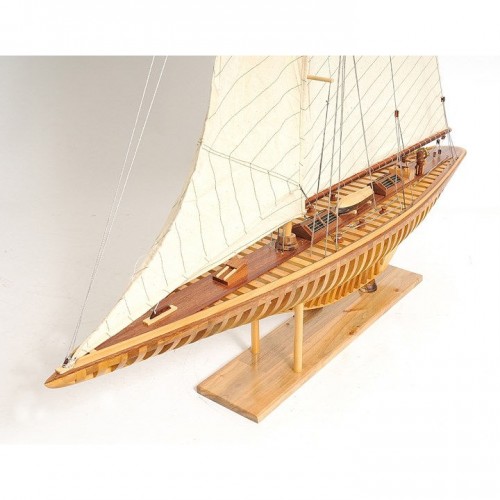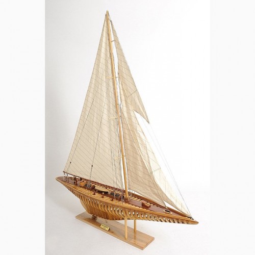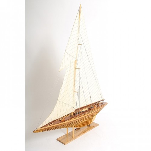 The Shamrock V is the J Class classic sailing yacht that is entirely built from wood in 1930ís. Own a piece of yachting history and have it displayed beautifully as a home or office decor. Master craftsmen handcraft these highly detailed wood models from scratch using historical photographs, drawings and original plan. They are built to scale with high-grade wood such as: western red cedar, rosewood, and mahogany. They are 100% hand built individually using plank-on-frame construction method and are similar to the building of actual ships. Each model requires hundreds of hours to finish and must go through a demanding quality control process before leaving the workshop. This model shows beautifully the framework with complete decking details of the shamrock V. The deck center are nicely furnished with wooden cabin, hatches and companionway. There is also a realistic miniature lifeboat between the cabins. The metal steering wheel can be seen aft right above the rudder. There are also winches around the deck to wind up or let out riggings when needed. The meticulously stitched sails and intricate rigging complete the definition of a true sailing boat. The model is secured tightly on a solid wood base with a brass nameplate. The mast and sails are folded down for easy shipping. Itíll make a perfect gift for home or office decorator, boat enthusiast, or passionate collector.