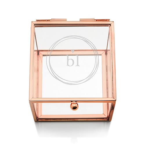 Store your trinkets and treasures beautifully in this small glass jewellery box featuring gorgeous rose gold edges, a hinged lid and a mirrored bottom. This little cube shaped beauty offers a stunning way to display your special jewellery pieces when you're not wearing them. Etched with a monogram featuring two initials topped with a sweet little heart and surrounded with a modern circle, this makes a classy gift for your bridesmaids, flower girl, mom or girlfriends.