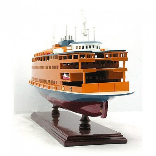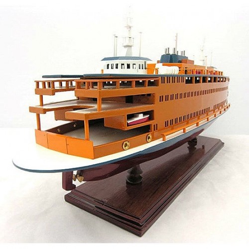 The Staten Island Ferry provides 20 million people a year (60,000 passengers a day not including weekend days) with ferry service between St. George on Staten Island and Whitehall Street in lower Manhattan. The ferry is the only non-vehicular mode of transportation between Staten Island and Manhattan. Have this historical ship displayed as a FULLY ASSEMBLED MODEL. Master craftsmen handcraft these highly detailed wood models from scratch using historical photographs, drawings and original plan. They are built to scale with high-grade wood such as: western red cedar, rosewood, and mahogany. They are 100% hand built individually using plank-on-frame construction method and are similar to the building of actual ships. Each model requires hundreds of hours to finish and must go through a demanding quality control process before leaving the workshop. The original colors of the Staten Island are accurately replicated in this model. All accent pieces are either made of wood or metal. The open window sills make the model authentic. Life boats are meticulously made from wood and painted. You can also notice other details such as the masts, railing, and barrels on the top deck. It is secured tightly on a solid wooden base. Itíll make a perfect gift for home or office decorator, boat enthusiast, or passionate collector.