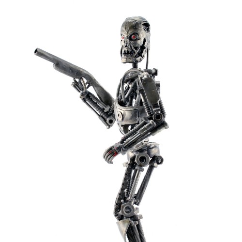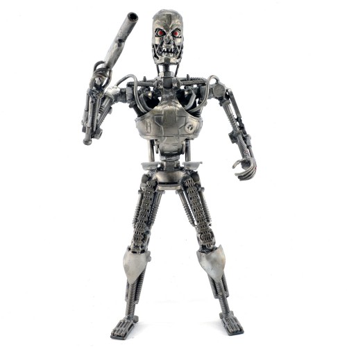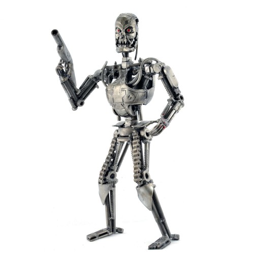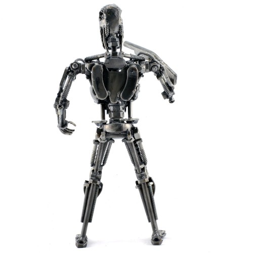 TERMINATOR sculpture is approx. 14 inches tall and has crazy detail! Our artist added all kinds of cool features like removable gun, moving head and torso. If you look close, you can recognize, bicycle chain, spark plugs, nails, screws,and nuts and bolts.