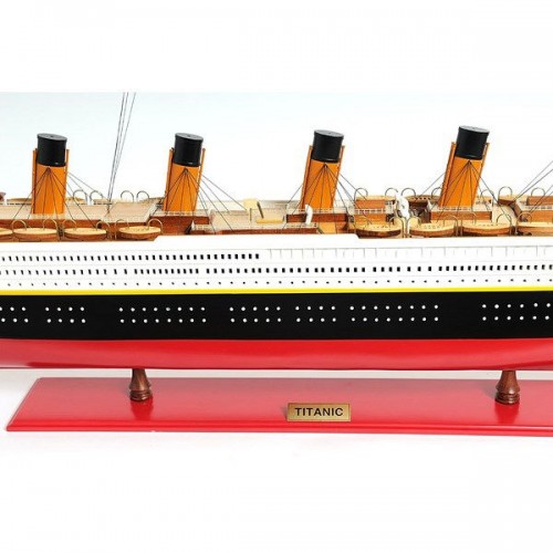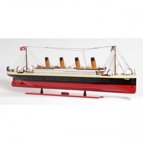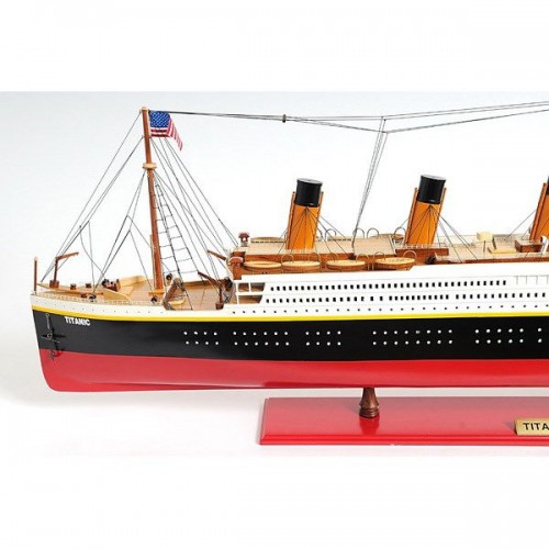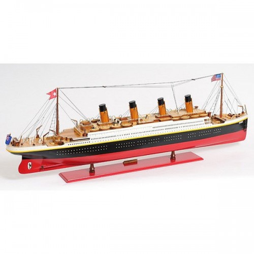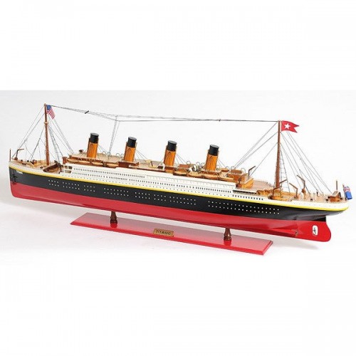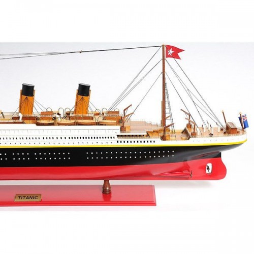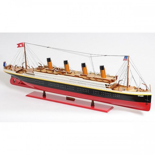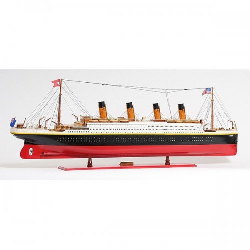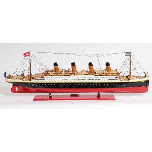 This is an XL and most accurate model of the famous RMS Titanic. The model is 100% hand built from scratch using ìplank on frameî construction method. Our master craftsmen have spent more than 150 hours to finish it. This model was painted in red, white and black, the original colors. It has magnificent details which include plank decking, metal rails, multiple life boats, davits, metal stairs, painted smoked stacks, anchors, and advanced rigging. Come with US, UK and white star flags. The word Titanic and home port Liverpool are painted on the hull. Rest on a solid wood base with metal nameplate.