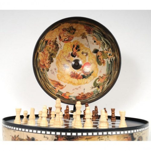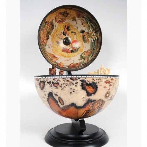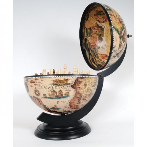 This is a unique globe with chess holder. Measured 13 inches in diameter, this globe will make a fine gift or decoration for your home or office! It features a removable chess board, a chess set, and stunning antique replica frescoes on the inner lid of the globe. The outer surface is also imprinted with an antique nautical world map. This globe comes with a dark wood base and requires some light assembly.