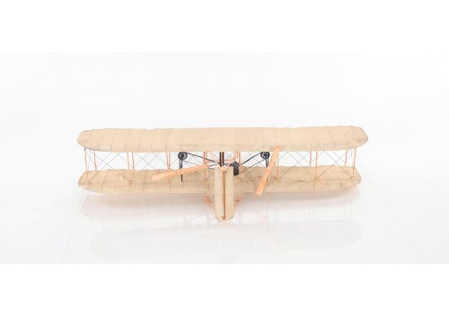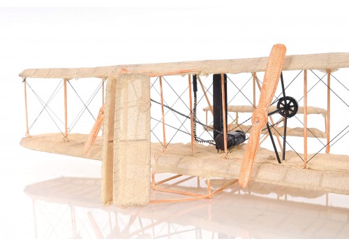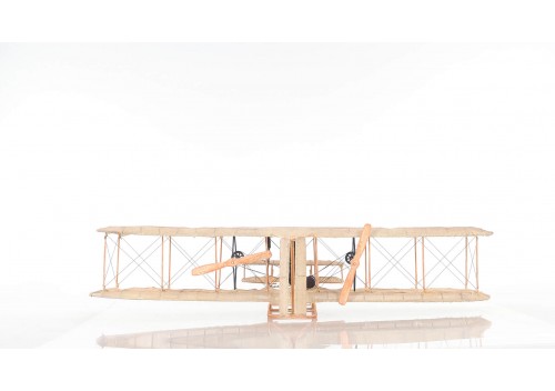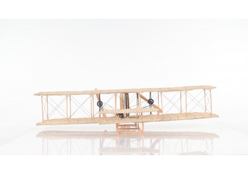The Wright Brothers Flyer was the first successful heavier-than-air powered aircraft, designed and built by the Wright brothers. This airplane model is 100% metal wired frame covered in fabric. The propellers also spin to add authenticity and bring life to the plane. When shipped, the item is packaged with foam inserts banded to pieces of cardboard to keep them held sturdily in place. ï 100% metal wired frame covered with a burlap fabric ï Wood propeller ï Wheels roll ï Propeller spins ï Metal plane details are securely welded on